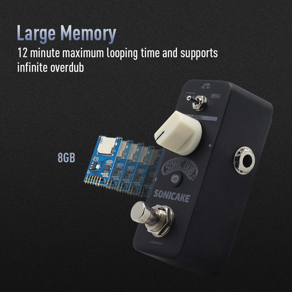 SONIC DUB es un pedal looper simple con 3 bancos de loops. Cada banco tiene un tiempo máximo de loop de 12 minutos y admite infinitas frases de sobregrabación. La calidad de grabación y reproducción de 24 bits a 44,1 kHz te brinda un sonido sin pérdidas. La operación con un solo pedal simplifica todo.