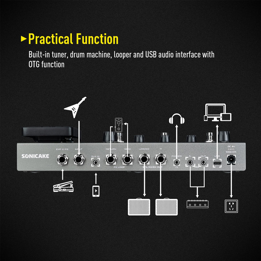 ● 100 ritmos de batería incorporados y looper de 90 segundos, 198 preajustes, cadena de señal ajustable con un máximo de 10 bloques de efectos simultáneos.
